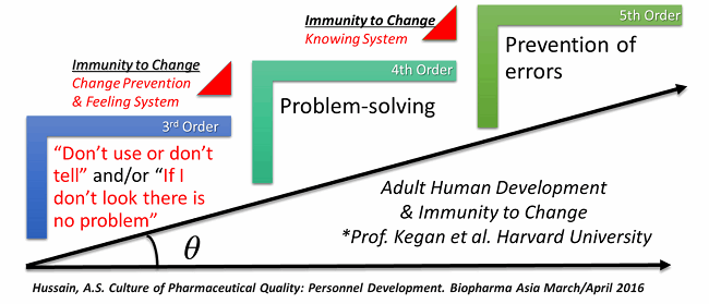 Historically the pharmaceutical regulatory system evolved as a reaction to one crisis after another, and over the years each new crisis added a layer of regulatory requirements — which has become the so-called “extensive regulatory oversight,” utilizing management standards to manage a sector that “is unable to manage itself.” The system has become so complex that we often find ourselves in over our heads. As Albert Einstein very simply put it, we will never solve the problems of tomorrow with the same thinking we used to create the problems of today. To elevate our thinking, we must overcome our immunity to change — a concept that discussed in the 2016 CPhI Annual Report.2, 3 This report illustrates how the constructive development theory of human development and the immunity to change concept, developed by Robert Kegen and colleagues at Harvard University, 7 provides a framework for us to objectively fill the gap between what we know and what we can implement in the pharma sector.