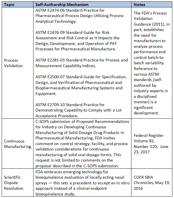 The FDA’s encouragement and support for continuous manufacturing and emerging technologies are abundantly evident. For the FDA to encourage industry to adopt these approaches, the constructive development theory suggests that it should facilitate self-authorship of the related performance standards, which is precisely what the agency is doing.