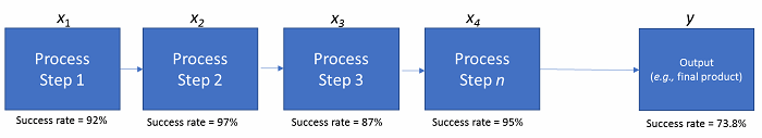 In the figure above, what’s called rolled throughput yield (RTY) is demonstrated across a series of fairly high-quality and well-measured process steps. Step 1 has a success rate of 92 percent (~ 1 error per 12 iterations), Step 2 has a success rate of 97 percent, etc. However, with the rules of probability, the overall RTY is the multiplicative product of all of the subordinate steps’ success rates. This leads to an overall outcome success rate of about 74 percent. So, one-quarter of the time, we’ll have an unintended effect or outcome in the final product to explain, justify, or scrap. More steps in a process, nested processes within a sentinel process, and input factors all work together to dramatically increase the level of complexity and decrease the probabilistic level of success for the final product(s).