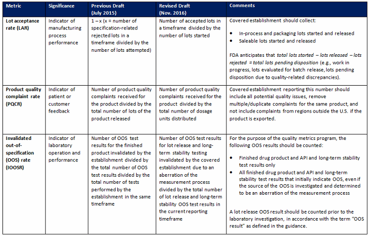 Based on the industry comments to the previous draft, the FDA has reduced the scope of the program from four primary metrics and three optional metrics (in the 2015 guidance) to three primary metrics. Those three are:
