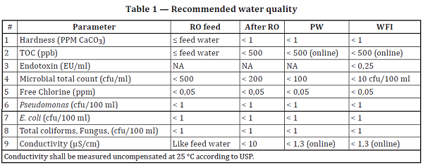 4.2.5 PW/WFI quality shall be according to the last revision of the local/national/relevant Pharmacopoeia. Table 1 provides recommended water quality.