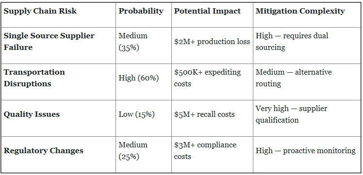 Critical Case Study — Supply Chain Disruption: A leading injectable manufacturer experienced a three-week production shutdown when their single-source API supplier encountered quality issues. The impact included: