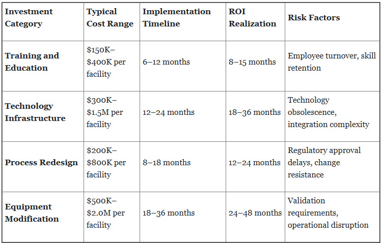 Lean manufacturing implementation demands significant up-front investments across multiple categories, with returns materializing over extended time frames that challenge traditional pharmaceutical business models.