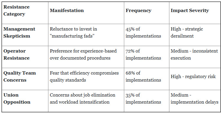 Pharmaceutical manufacturing cultures historically emphasize procedural compliance over operational efficiency, creating substantial resistance to lean transformation initiatives that challenge established practices.