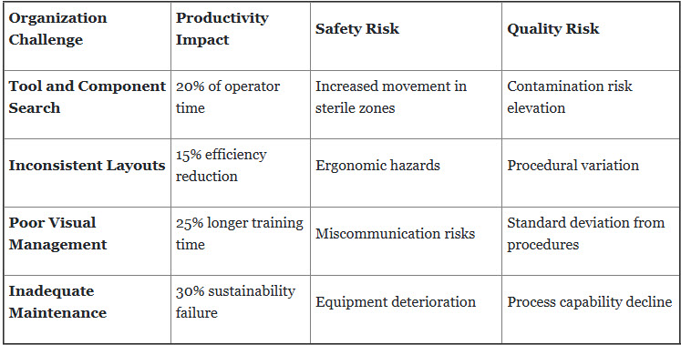 Challenge Scope: Poor workplace organization creates extended search times, increases safety risks, and reduces operational efficiency within sterile manufacturing environments.