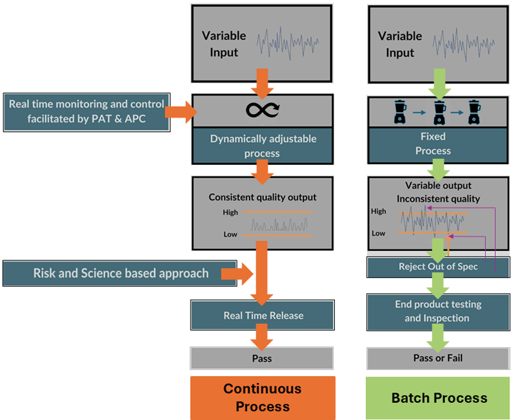 One of the key benefits of PCM is the potential to measure and control the processing of material and ensure that all accepted product is processed within predefined limits. That doesn’t mean all material is within specification, but if process drift is detected the equipment will either compensate for the drift before it is out of specification or reject material that is out of specification. This ensures that the final products manufactured are all within specification. Since the intermediates are transferred from one unit operation to the next without interruption, CQAs can be monitored in real time. This way, any variability of CPPs can be adjusted dynamically according to the level of automation and in-process feedback facilitated by PAT. In-line measurement and control eliminate the uncertainty associated with sampling plans and avoid the risk of Acceptable Quality Level (AQL) and Lot Tolerance Percent Defective (LTPD) frameworks. Coupled with an RTRT strategy, the overall cycle time for manufacturing to product release is much shorter. An example is shown below in Figure 1.