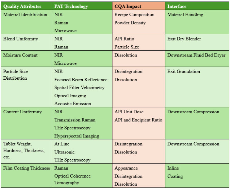 Figure 2 lists the typical CQAs for an oral solid dosage (OSD) process relating to product quality. CQAs are generally associated with drug substances, excipients, intermediates (in-process materials), and drug products. NIR is relevant to CU measurement since it is fast enough to allow in-line monitoring. Transmission sensors such as Raman spectroscopy are more accurate but much slower and thus are mainly implemented for at-line and online devices.