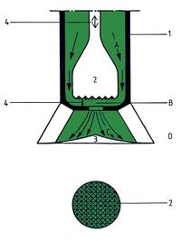 Due to the speed increase (A) in the turbulent pipe (1), the premixed product, reaches the homogenizing section (B) and then is transferred through the particle size reducer (2) Due to the high speed, the turbulence is created in relation to the gap in the reduction zone (4). Finally the product is projected with a high velocity on the impact plate generating a shock.