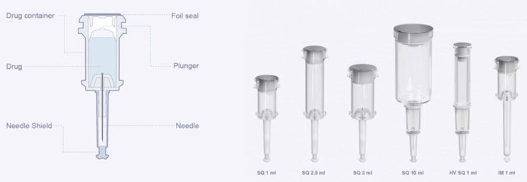 Oval’s COC drug containers are injection moulded, allowing designs to be tailored to the needs of each drug. Additional features, such as clips and cams, can be integrated directly into the container design unlike with glass. This cuts down on part numbers and limits tolerance chains, resulting in a more compact, precise product. Container size and shape can also be much more easily adapted for the needs of the drug, and a wide range of needle lengths and gauges can be accommodated.