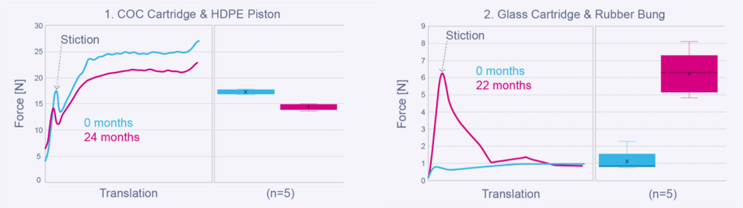 The use of a COP cartridge & high-density polyethylene (HDPE) piston (1) in Oval’s PDCs over a glass cartridge and rubber bung (2) allows silicone lubricants to be eliminated. This means there is no increase of stiction over time due to silicone migration, which, alongside removing the general inconsistency found in glass/rubber interfaces, allows Oval’s PDCs to achieve much more consistent drug delivery times, both between batches as well as over time. This directly benefits the user – reducing the occurrence of stalled and inconsistent drug delivery, making it less likely that the user removes the device before delivery is complete leading to a "wet injection*".