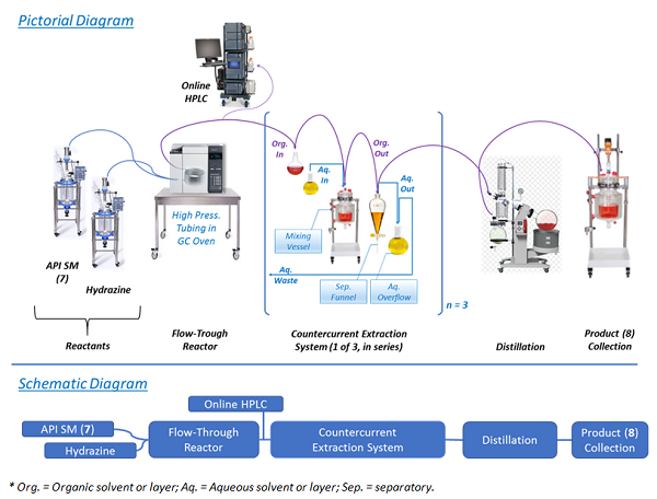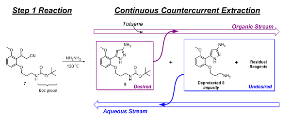 Following the Step 1 reaction, purification of the product (8) and exchanging of the solvent were performed. This was accomplished using continuous countercurrent extraction as diagrammatically illustrated in Figure 2 and explained, based on chemical principles, in Figure 3.