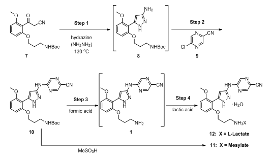 The process utilized to produce 12, in four steps, from an advanced intermediate (7) is shown in Figure 1. Step 1 is a reaction of a Boc-protected compound with a highly toxic and reactive reagent, hydrazine, in a flow-through reactor resulting in pyrazole formation (8). Step 2 is a nucleophilic aromatic substitution reaction with a chloropyrazine (9). Step 3 removes the Boc protecting group in an acid-catalyzed reaction. Finally, Step 4 (when the lactate salt is desired) is the salt formation reaction.