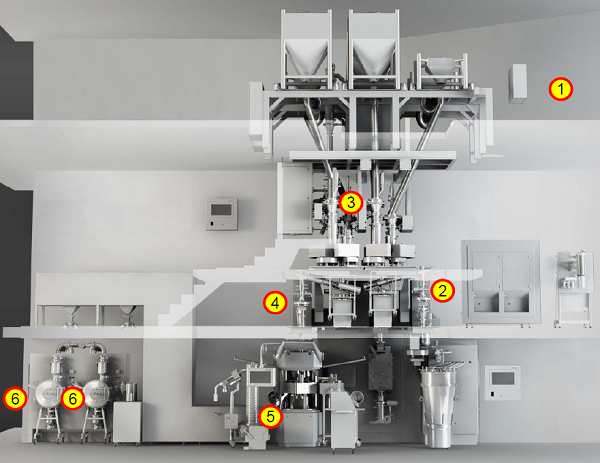 Figure 4: Vertex-GEA CM rig.13 1. At-line NIR incoming material attributes; 2. NIR blend potency; 3. Granule properties (3a. NIR granule uniformity, moisture; 3b. Laser diffraction particle size); 4. NIR final blend, potency and moisture; 5. Tablet properties (5a. Raman API form and identification; 5b. Weight, thickness, hardness); 6. Raman film coat thickness.