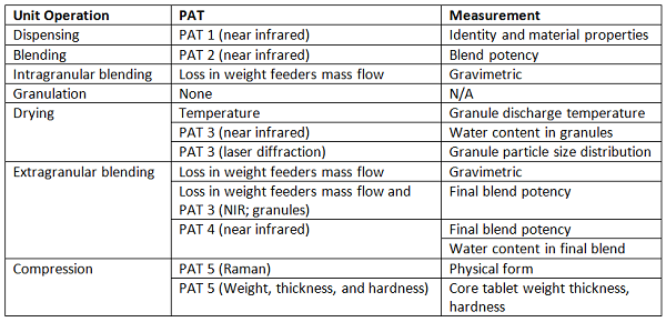 Shown in Figure 4 is a system that operates in continuous mode from individual component feeding in to film-coated tablets, at one of the production sites,12 and shown in Table 2 is an associated list of the unit operations, the PAT tools, and the measurements made. The individual measurements are combined in a control strategy that allows the entire process to be continuously monitored. This enables process adjustments to be made, as needed, to ensure material conformance to specifications, and enables segregation of nonconforming materials.
