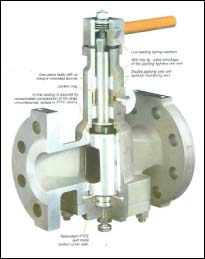 Double Gasketed Systems are found primarily on valves designed to meet EPA "zero emissions" standards. They consist of a set of packing on the valve stems, a spacer in the valve bonnet, followed by a second set of packing. The space between the packing is tapped and can be equipped with purge and drain tubing, and leakage detection (see picture at right). These systems are reliable, but their major disadvantage is cost and the fact that it only protects from valve stem leakage (which is the primary but not the only source of leakage for valves). In some cases, this approach can be retrofitted to existing valves (Jamesbury and Xomox make retrofit kits for their ball valves). It should be considered for all new installations. Worcester makes a model 94 ball valve of this type in standard stainless ASME flanged design and in a 3-piece tri-clamp sanitary tubing design. Xomox makes butterfly, ball, and plug valve double gasketed system. Consideration should still be given to containing the body of the valve to assure control of leakage at the piping connections and at the body joints. LGE is unaware of any diaphragm valves with secondary stem seals.