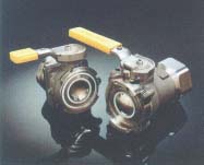 Victualic provides a double butterfly valve design for making and breaking connections. It is simple to operate but has a larger exposed area to clean when the units are disconnected. They are available from 1" up to 3" with working pressure of 210 to 120 psig respectively. They have an operating temperature range of 20°F to 230°F with Teflon seals and stainless steel or Hastalloy parts. Aeroquip makes a double ball valve system (see picture at right supplied by Aeroquip). One ball is scooped out to accommodate the other and provides very good interlocks to prevent opening while the ball valves are not together. They are rated for up to 250°F and 600 psig (3/4" & 1", 300psig 1-1/2, 2 &3") with Teflon seals and stainless steel or Hastalloy parts.