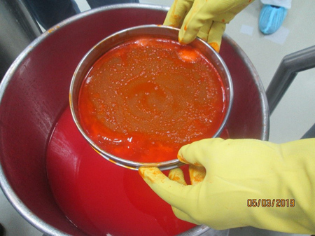 Photo 6: We see small slugs that have been isolated after mixing a red color solution using a #80 mesh screen.