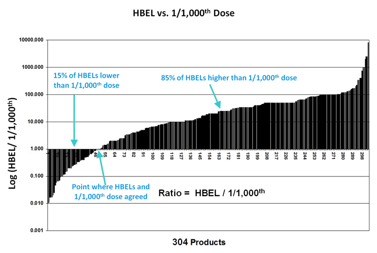In 2016, a study was published that compared 304 HBEL (ADE) values against the 0.001 dose-based limits from several large pharmaceutical companies.17 This study revealed situations where the previous 0.001 dose-based limits were not low enough and potentially posed a risk to patients. The study also revealed situations where the previous the 0.001 dose-based limits were lower (often much lower) than those calculated using the HBEL.