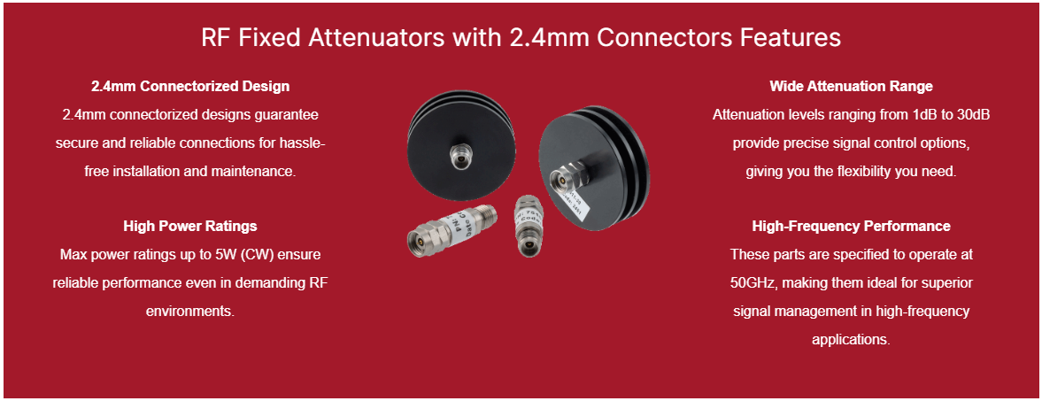 Elevate your signal management capabilities with Fairview Microwave's RF fixed attenuators featuring 2.4mm connectors and high-power ratings.
