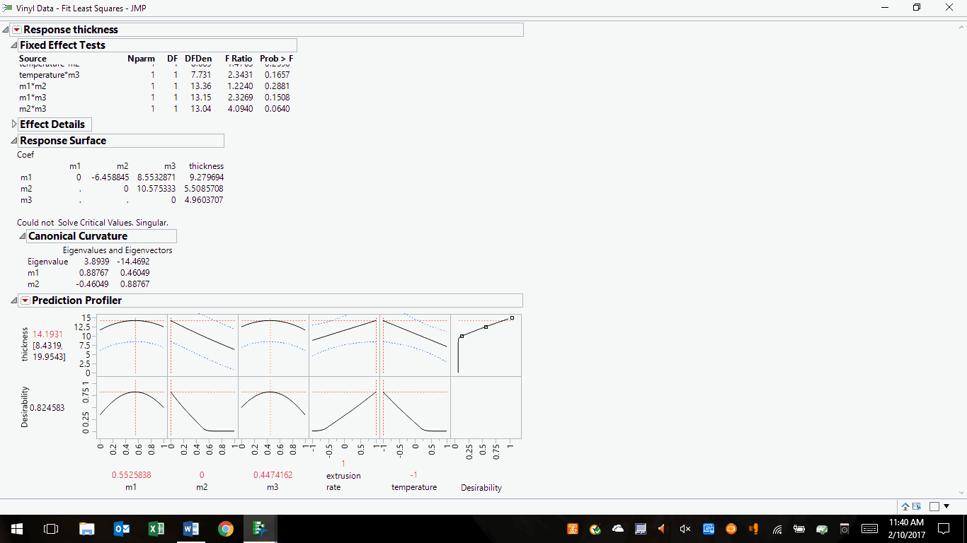 In the first row of images, note that desirability is nil, yet the product thickness is sensitive to ingredients m1, m2, m3, and extrusion rate as noted by the curvature and slopes of their plots. Conversely, the process is insensitive to temperature as shown by its flat line. However, desirability is sensitive to ingredients m1, m3, and extrusion rate, and insensitive to m2 and temperature. At this point, our DoE has given us considerable process understanding. The profiler itself will help direct the experimenters’ next step.