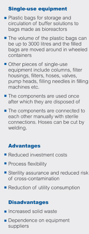 The investment required for single-use equipment, on the other hand, is significantly less than for a stainless steel factory. The plastic bags and components are cheaper than stainless steel equipment and their cost can be dedicated to each batch produced. The facility still has to be built or modified for the single-use production process, but due to the smaller space requirements the investment cost will be smaller compared to the stainless steel alternative. The hours spent on validation can also be decreased as no cleaning and sterilization is needed.