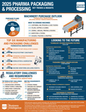In addition to the top pharma manufacturing challenges, the infographic also reports on machinery purchase intent, packaging innovation, regulatory challenges and sustainability priorities, among others.