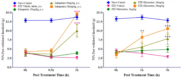 The tactile allodynia was validated by calculating 50% Paw withdrawal threshold following the application of mechanical stimuli with von Frey filaments. It was observed that that the control animals showed withdrawal response at ≥12g, whereas the STZ-induced rats showed withdrawal/pain response at lower force stimuli as indicated by the threshold values (50% Paw withdrawal threshold ≤ 5g). Gabapentin (anticonvulsant medication for neuropathic pain) and Duloxetine (FDA approved for the pain associated with diabetic peripheral neuropathy) exhibited dose-dependent significant reversal of tactile allodynia (Figure 2 and Figure 3).