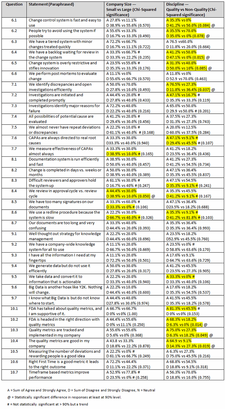 Survey Analysis by Company Size and Discipline, Questions 6-10