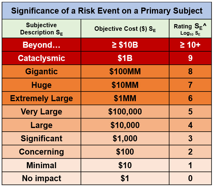 The most obvious attribute of a risk event is the significance of the effect or objective event on the subject. For a harm risk, it is the severity of the subject’s loss. While risk events have a wide variety of impacts, some highly subjective, every consequence event can be evaluated according to its monetary impact. A risk’s impact, either positive or negative, can be measured using the three scales shown in Table 1.