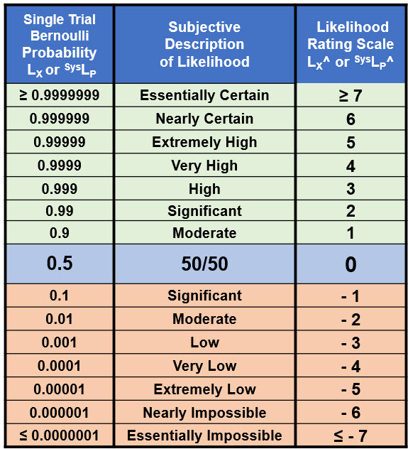 The rating values from 7 to -7 span the useful range of probabilities and can be extended in either direction as needed. The top half of Table 2 usually represents a success rate while the bottom half represents a failure rate. For example, a failure rate for event X of LX^ = -2 (1%) corresponds to a success rate of ⌐LX^ = 2 (99%) and vice versa. The symmetry around 50% is a useful feature for translating a success rate into a failure rate for evaluating compound risk sequences that are modeled as a combination of benefit and harm risk system sequences. Thus, a system that is evaluated as a benefit risk can be incorporated into a failure risk sequence using the relationship ⌐LX^ = – LX^.