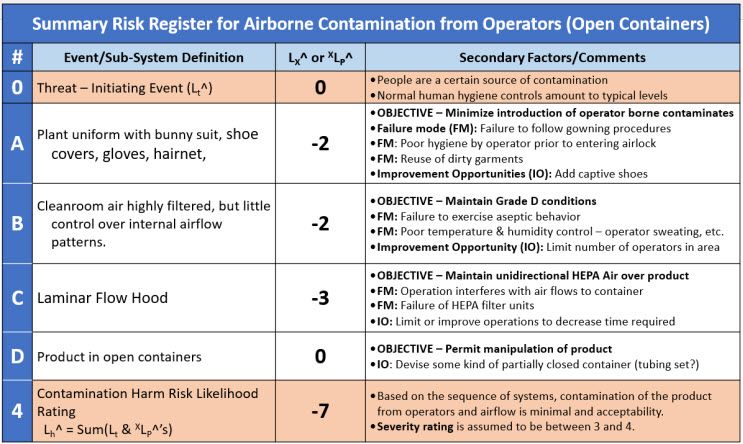 The risk register summarizes the results of the team’s risk analysis. Given the team’s assumptions and the estimated performance of the four systems, the likelihood of contamination 4LH^ = -7 or essentially impossible unless one or more failure modes occur.