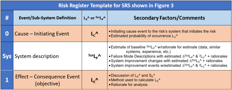 - Draft a RR – Prepare a risk register template that describes the SRS event and system sequence. Some intermediate events could represent important control points for evaluating and controlling the overall risk.