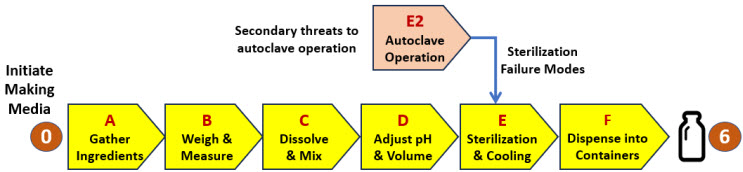 The procedure for making media can be summarized in six systems as shown in the SRS in Figure 5. For illustration purposes, a seventh system (E2) is added to describe a secondary system required for controlling an important failure mode associated with the sterilization process system E. If the analysis team deems it appropriate, secondary risk systems can be added to any primary system to control failure modes.