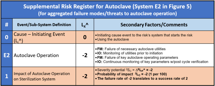 Table 7: A supplemental risk register for the secondary risk to the sterilization system of the autoclave failing shown in Figure 5. The autoclave (system E2) is evaluated as a harm risk with a failure rate of -2 taken to the primary RR as a success rate of 2.