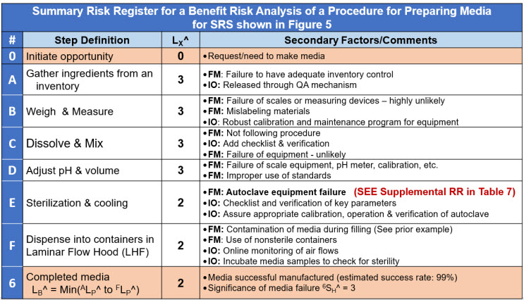 Table 6: A very brief risk register for the benefit risk shown in Figure 5 of a procedure to make media. System E has a supplemental RR for a primary failure mode. The RR does not include quantification of either 2LC^ or ΔXLP^ failure modes.