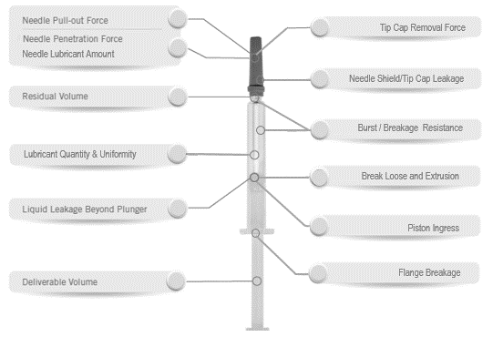 For a given container, such as a prefilled syringe, there are several interfacing components whose fundamental performance must be thoroughly understood when assembled. See example shown in Figure 1, which shows a variety of important performance tests to consider for a finished prefilled syringe. These tests focus on multiple interfaces, some of which can be directly influenced by the drug product, automated assembly, shipping, storage and even final use.