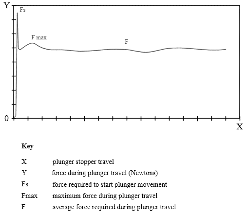Break Loose and Extrusion This EPR test is intended to gain understanding of the forces involved with plunger actuation within a prefilled syringe. This test can also be performed to evaluate the uniformity of syringe barrel lubrication, and in this case, it would be performed on a dry syringe. In the case of a prefilled syringe combination product, the break loose and extrusion forces are important to understand as they are directly influenced by drug property interactions with the syringe plunger and syringe barrel inside the lubricated surface. Other factors of significant influence on extrusion or glide forces include the needle inside diameter, drug product viscosity, target injection rate and the syringe inside diameter. As shown in Figure 3, the force curve shows syringe plunger movement starting or initiating force (Fs), the maximum force (Fmax) after initiation, and the mean or average force (F). This force profile is important in that it quantifies force profiles generated due to the fit of the plunger within the syringe barrel while attached to the plunger and associated component interfaces and parameters mentioned previously.