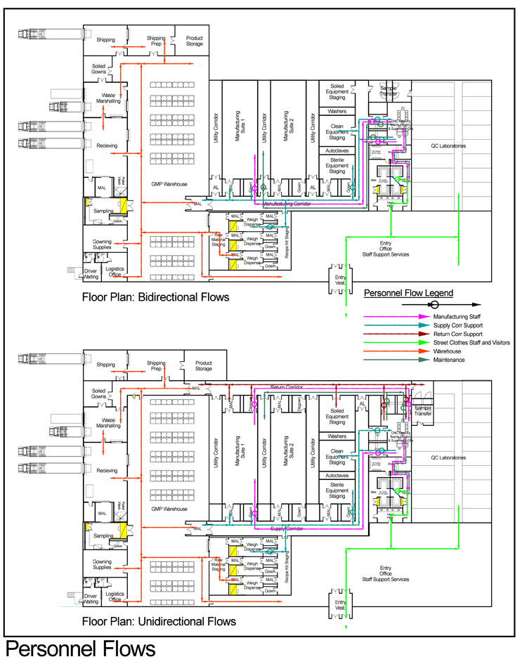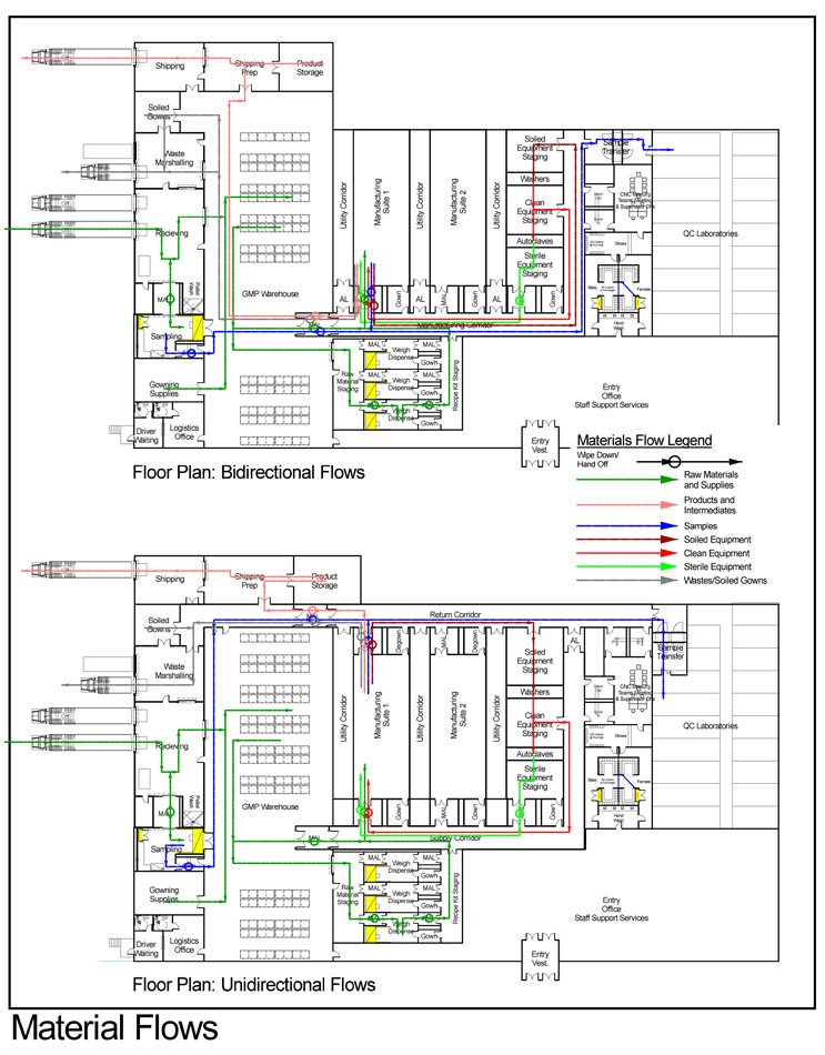 In the case of a manufacturing facility that produces a single product, or multiple products by campaign, and based upon closed, fixed, and automated process systems cleaned in place, there may be little risk associated with bidirectional flows. In such a facility there are often relatively few staff and little direct contact with the product during manufacturing. Degowning of staff upon egress from a manufacturing suite to the manufacturing corridor may be sufficient to satisfy the risk of contamination to the relatively few materials, supplies, and equipment transported therein.