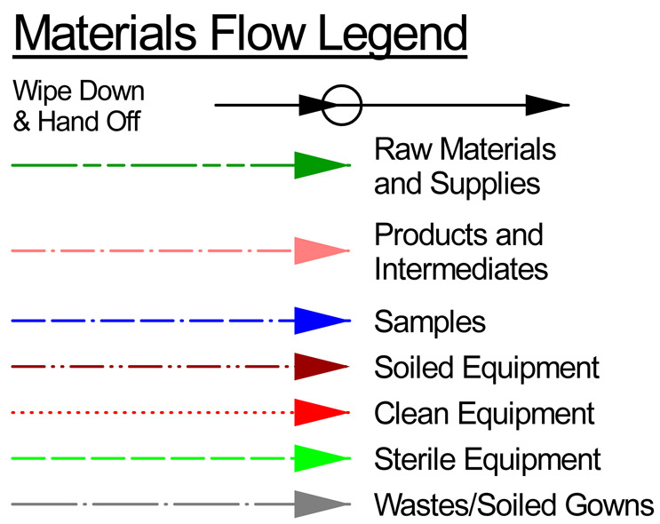 In terms of flows, each manufacturing suite needs to be supplied with staff, supplies, raw materials, etc., on the incoming side, and products, samples, wastes, and exiting staff must be removed. In general terms, these in and out flowing streams occur concurrently and continuously unless limited by procedure. Should all incoming and outgoing flows share a physical path at any point within the facility, the opportunity for undesirable results exists. If distinct physical paths can be defined, the opportunities do not exist. Example layouts of each configuration are shown below with flows for personnel and materials.