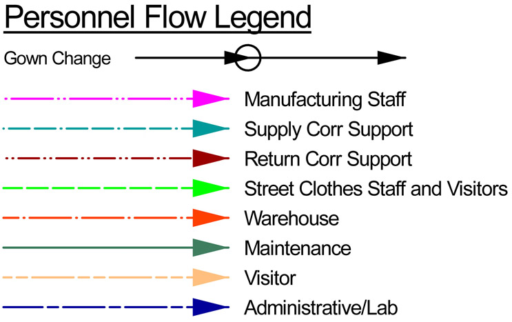 For people flows, the drawing may distinguish between several functional groups. At minimum, the drawing will always include manufacturing staff. Additionally, there may be an assortment of other groups such as visitors, maintenance staff, process support staff, warehouse staff, or other specific subsets of staff appropriate to describing the design and operation of the facility.