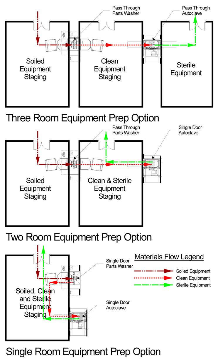 - The three-room process incorporates a first room dedicated only to soiled equipment that is loaded into pass-through washing equipment, removed in the middle room that is dedicated only to clean equipment that is then loaded into autoclaves, finally to be removed upon completion of the sterilization cycle in a third room dedicated solely to sterile equipment.