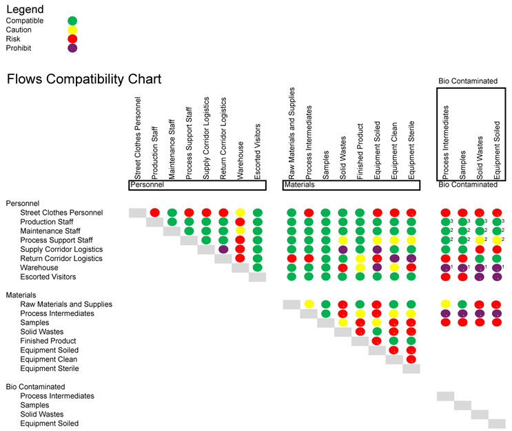 Of the various flows of materials and personnel accommodated in the facility design and represented on its flow plans, some types may readily and safely coexist, such as clean equipment, new supplies, and gowned, neutral manufacturing staff, and some pairings may be cause for concern, such as clean equipment and wastes or soiled equipment. As illustration, the table below offers an example, high-level guide to evaluating the potential risks of common flows. It is not proposed as authoritative in any particular case.