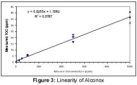 To demonstrate the precision and accuracy for this TOC method, a representative solution of CIP-100 as 1000 ppb, or 1 ppm as carbon, was analyzed sequentially ten times. This carbon concentration was chosen to evaluate these method parameters because, in general, TOC residual limits are typically around 1 ppm. Results are listed in Table 2. At this TOC level, the precision was ± 1% and the accuracy was ± 5%.