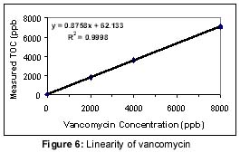 CIP-100 (alkaline), CIP-200 (acidic), Alconox (emulsifier), and Triton-X 100 (wetting agent). Results are shown in Figures 14. Correlation coefficients ranged from 0.9787 to 0.9998. Alconox and Triton-X 100 have a tendency to "foam" depending on the concentrations that are analyzed and this "foaming" phenomena can have a negative effect on the accuracy of the TOC result (reduced R2). Three representative examples of active substances were also tested for linearity: an excipient (sucrose), an antibiotic (vancomycin), and endotoxin. Results are shown in Figures 57. All three compounds demonstrated excellent linearity with correlation coefficients (R2) ranging from 0.9996 to 0.9998.