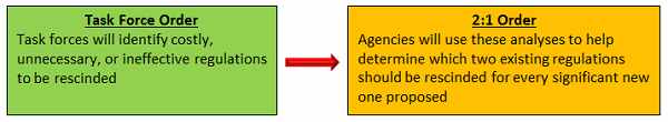 On Jan. 30, the president issued what is now known as the “2-for-1” (or 2:1) order, directing federal agencies that promulgate any new regulation to offset the cost by rescinding two existing regulations. Then as a follow up, on Feb. 24, he issued the Task Force order, directing each federal agency to establish a task force charged with a range of deregulatory responsibilities.