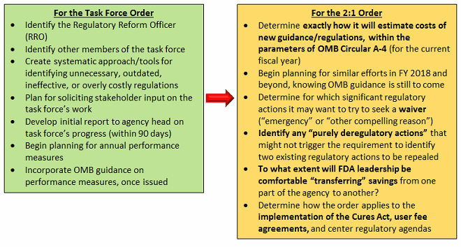- Within 60 days, each agency must appoint a Regulatory Reform Officer (RRO) to oversee regulatory reform initiatives and policies to ensure that agencies effectively carry out reforms. (Just as with the 2:1 order, this could potentially be defined as taking place at the HHS or FDA level; guidance is still to come on the Task Force order.)