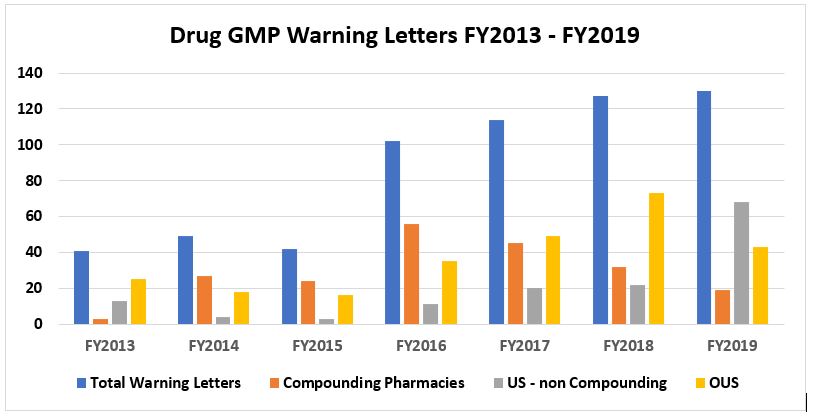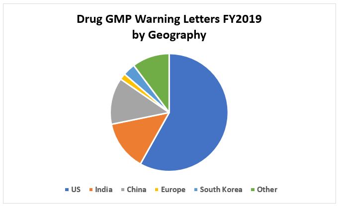 FY2019 was a fascinating year for drug GMP warning letters in the diversity of topics addressed, depth of focus, and trends in enforcement actions. The most significant news is that the number of warning letters issued to sites in the U.S. increased significantly. For the first year since I started monitoring this in FY2013, warning letters issued to firms in the U.S. constituted a majority of the drug GMP warning letters, far outpacing India and China combined.