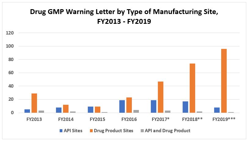 ****In FY2019 one warning letter was issued to a drug distributor, two to an API repackager, one to a drug product repackager, and two to contract laboratory organizations (CLOs) that are not counted in any of the API or drug product categories