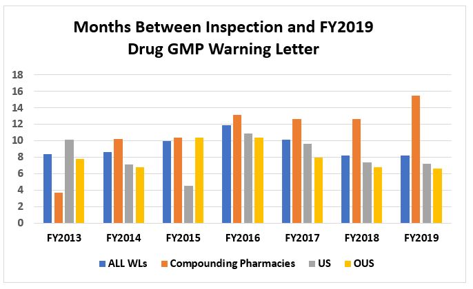 - The intervals between inspections and warning letters continue to decrease, with the exception of warning letters issued to compounding pharmacies, where the interval increased in FY2019 (Table 3, Figure 6).