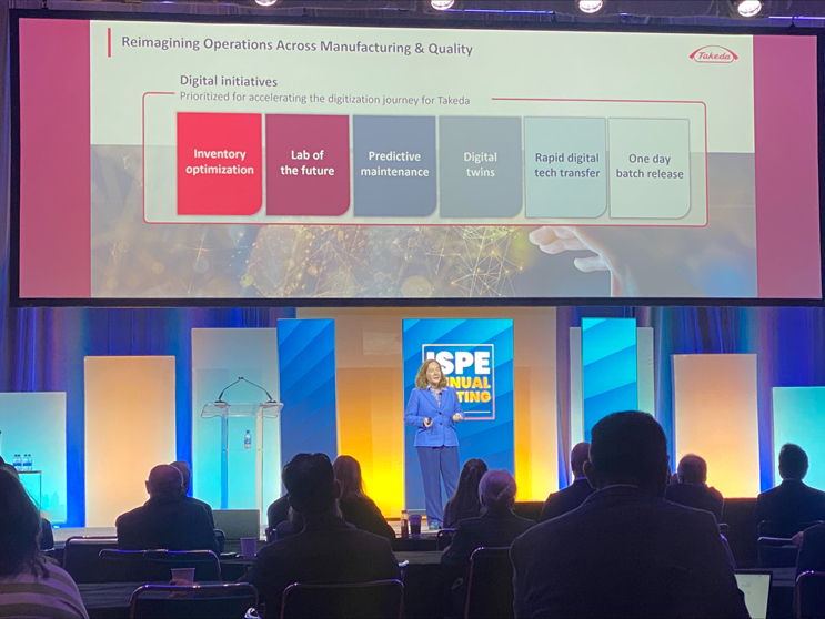 In her presentation, Elaine Shannon of Takeda echoed, “AI is reshaping our business at an unprecedented pace.” Her company has a predictive maintenance system using AI and machine learning digital agents to detect and diagnose equipment issues early. It can reduce equipment failures by 20-30%. Other digital initiatives in quality control at Takeda include: inventory optimization, lab of the future, digital twins, rapid digital technology transfer and one day batch release.